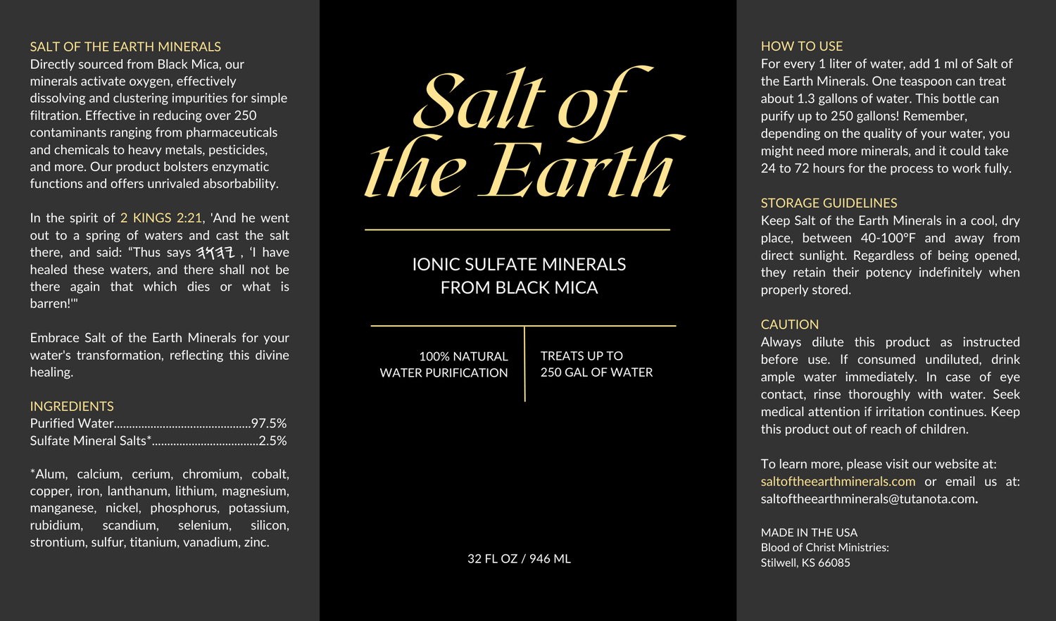Salt of the Earth Minerals embodies the enduring purity and preservation promised in the scriptural covenant of salt. The Old Testament recounts several instances of the covenant's strength and the purifying power of salt, notably when Prophet Elisha purified a spring of water using salt in 2 Kings 2:21. Our product embraces this ancient wisdom to purify your water and infuse it with essential minerals, strengthening and enhancing your overall wellness.